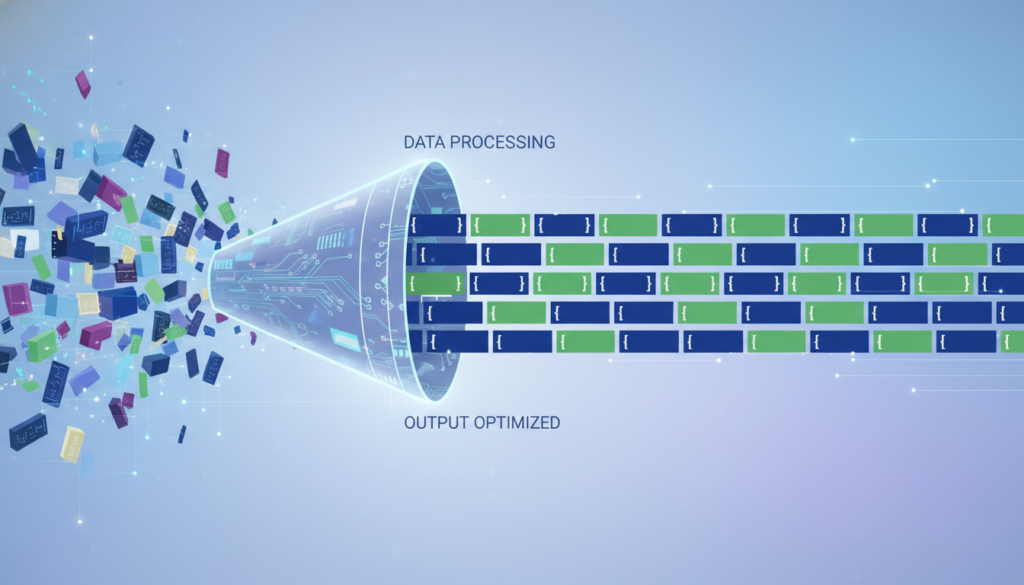 A digital visualization of code blocks flying into a funnel and coming out perfectly aligned and color-coded on the other side.