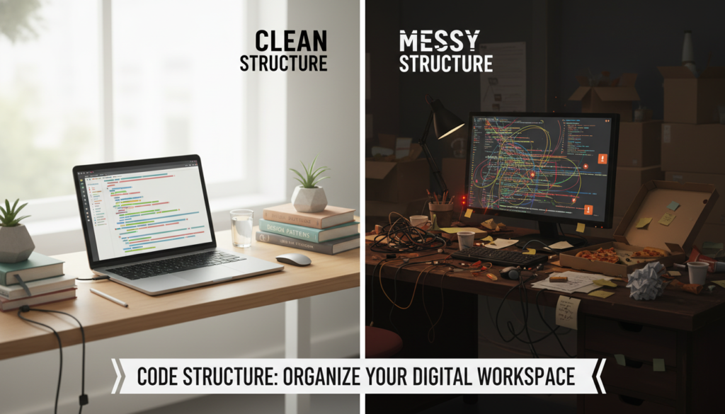A split-screen illustration showing a clean, organized office desk on one side and a cluttered, chaotic desk on the other, representing clean vs. messy code structure.