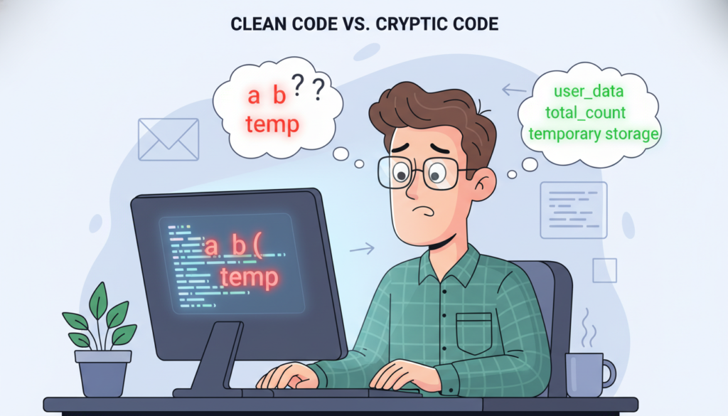 A cartoon of a developer looking at a glowing computer screen with a confused expression, with thought bubbles showing cryptic variable names like ‘a’, ‘b’, and ‘temp’ vs. clear names.