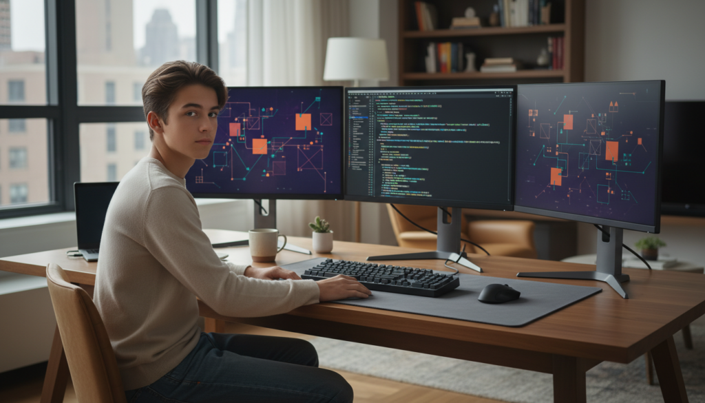 A professional editorial photograph of a young teenager sitting at a clean desk with multiple monitors showing code and colorful diagrams, shot on Sony A7R IV, natural daylight, high resolution