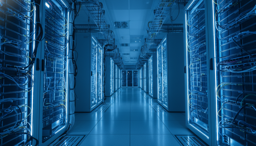 A professional editorial photograph of a massive, modern server room with glowing blue LED lights and organized cables, shot on Sony A7R IV, high resolution