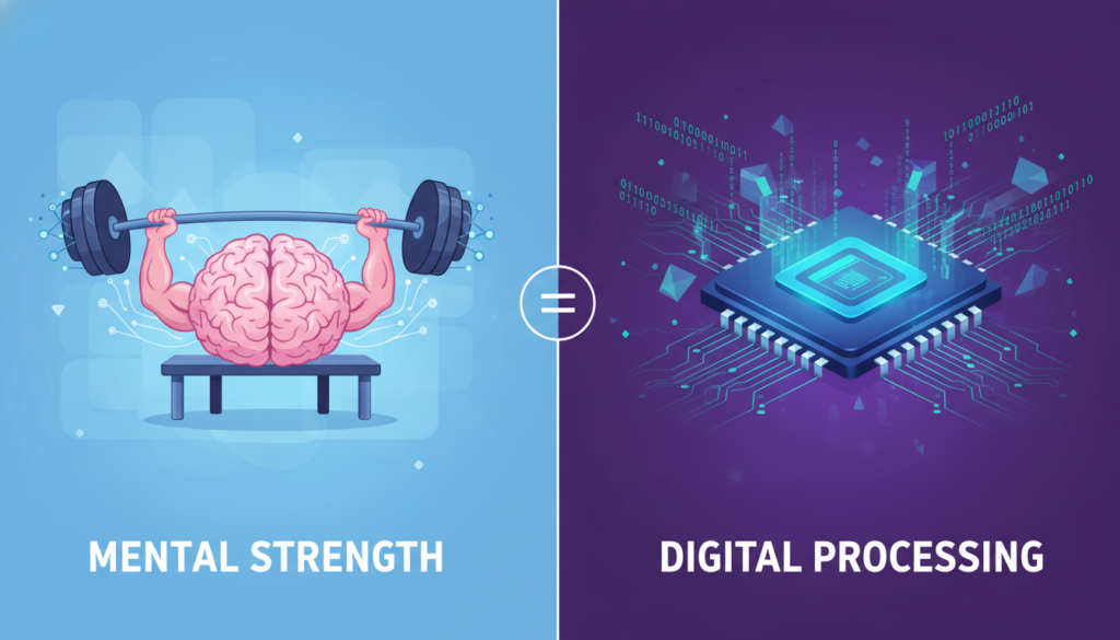 A split screen showing a brain lifting weights on one side and a computer chip processing data on the other side