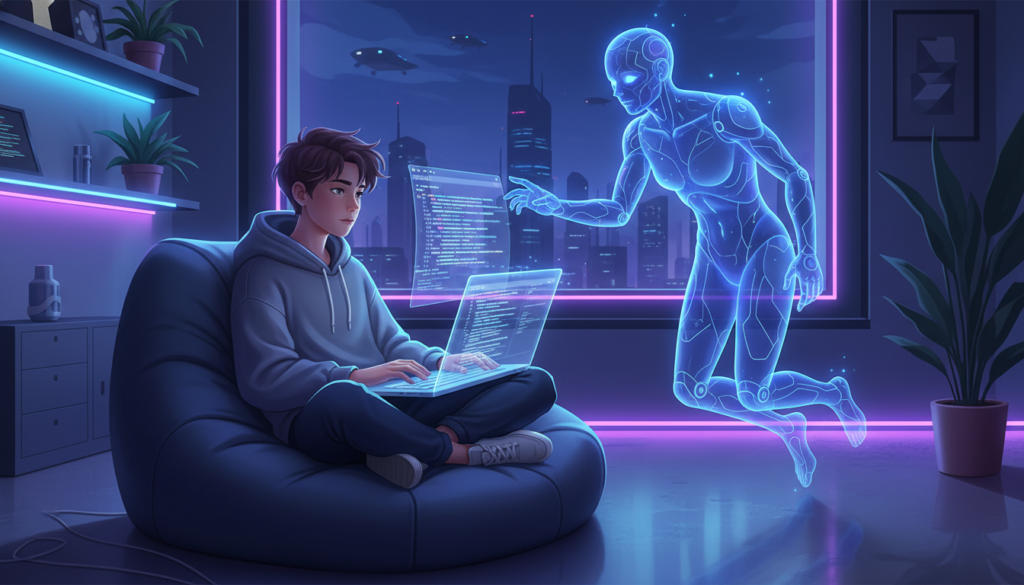 A young developer sitting in a neon-lit room with a holographic AI assistant helping them write code on a sleek laptop