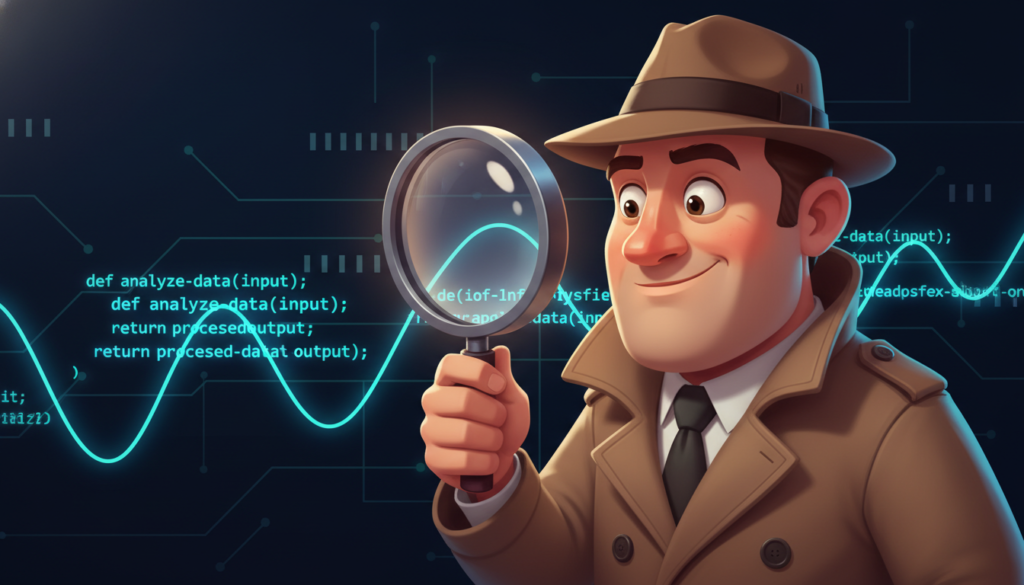 A cartoon detective with a magnifying glass examining a glowing line of computer code