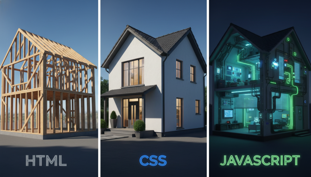 ` and knows it is a paragraph. It sees “ and renders a clickable box. Without HTML, you have nothing. You have a blank void. It is the raw content and the structure that holds that content in place. Semantic HTML: Why It Matters Ambitious developers often make the mistake of using a generic “ tag for everything. While that works visually if you style it enough, it is like building a house entirely out of duct tape. Semantic HTML means using the right tag for the job. Use “ for the top stuff, “ for the main content, and “ for the bottom stuff. This helps search engines understand your site, which drives the kind of traffic we talk about over at https://beemytech.com/. The Skin: CSS (Cascading Style Sheets) If HTML is the drywall and 2x4s of our house, CSS is the interior designer. Without CSS, every website looks like a Word document from 1995. Times New Roman, black text, white background, and blue hyperlinks. It is functional, but it is ugly. CSS handles the presentation. It tells the browser, “Hey, take that “ tag we found earlier? Make it 48 pixels tall, color it charcoal grey, and use the Roboto font.” It controls layout, colors, spacing, and even animations. The Cascade Explained The “C” in CSS stands for Cascading, which is a fancy way of saying “hierarchy.” If you tell the browser that all paragraphs are red, but then you tell it that specific paragraphs inside a sidebar are blue, the sidebar rule wins because it is more specific. Mastering this specificity is often the hardest part for beginners. You change a line of code here, and suddenly a button three pages away moves five pixels to the left. It is a rite of passage. Modern tools have made this easier. You might see developers using utility classes or pre-processors, but under the hood, it all compiles down to raw CSS. If you want to see some truly sleek examples of modern design implementation, keep an eye on the resources we curate at https://beemytech.com/. The Muscle: JavaScript (JS) We have a house (HTML). It looks beautiful and is painted perfectly (CSS). But the lights do not turn on. The faucets do not run. The garage door does not open. It is a static model home. To make it livable, you need electricity and plumbing. You need functionality. That is JavaScript. JavaScript is the only actual “programming language” of the three. It has logic, variables, functions, loops, and math. It handles the verbs of the web. PRO TIP: A clean, isometric diagram of the browser rendering path, visualizing the flow from HTML parsing to the DOM tree, merging with CSS styles, and finally JavaScript interacting with the elements. When you click a “Submit” button and the page validates your email address without refreshing? That is JavaScript. When a map lets you drag it around? JavaScript. When Netflix automatically plays the next episode to ruin your sleep schedule? You guessed it. JavaScript. The DOM: Where the Magic Happens This is where the trinity unites. The browser takes your HTML and creates a tree-like structure in memory called the Document Object Model (DOM). JavaScript can reach into this DOM, grab an element (like a box), and change it in real-time. For example, you can write a script that says: “Listen for a click on this button. When it happens, find the box with the ID ‘content’ and change its background color to pink.” How They Render Together Understanding the sequence of events is critical for performance. Here is the play-by-play of what happens when you visit a URL: 1. The Request: Your browser sends a request to the server. 2. Parsing HTML: The browser receives the HTML file and starts reading it. It begins building the DOM. 3. Fetching Resources: As it reads the HTML, it finds links to CSS files and scripts for JS files. It pauses to go fetch them. 4. The Render Tree: The browser combines the DOM (structure) with the CSSOM (styles) to figure out where everything goes. 5. Painting: The browser actually draws the pixels on your screen. 6. Execution: JavaScript kicks in to make things interactive. If you put a massive JavaScript file right at the top of your HTML, the browser pauses everything to read it, leaving your user staring at a white screen. This is why we usually put script tags at the bottom of the body or use attributes like `defer`. It is all about perceived performance. Tools of the Trade You do not need expensive software to write this code. In fact, you could do it in Notepad, though I highly recommend against it for the sake of your sanity. Here is the standard toolkit for the ambitious web pro: The Editor: Visual Studio Code is the undisputed king right now. It is free, fast, and has a massive ecosystem of extensions. The Documentation: Never guess. The MDN Web Docs by Mozilla are the bible of web development. If you are unsure what a specific HTML tag does, look it up there. The Playground: Want to experiment without setting up files? CodePen allows you to write HTML, CSS, and JS in the browser and see the result instantly. The Browser Tools: Every modern browser has developer tools built-in. In Chrome, press F12 or right-click and select “Inspect.” You can view the console, debug JavaScript, and tweak CSS values on the fly. The Bottom Line It is easy to get lost in the hype of the latest frameworks. React, Angular, Svelte, and whatever new library released five minutes ago are all fantastic. But they are all just wrappers around these three core technologies. React generates HTML. Tailwind generates CSS. TypeScript compiles to JavaScript. If you focus on mastering the Trinity, you become framework-proof. You can learn any new tool because you understand the primitive materials it is built from. It is the difference between a cook who follows a recipe and a chef who understands flavor profiles. So, open up a text editor. Write an “ tag. Style it red. Make it alert “Hello World” when you click it. It is simple, but it is the foundation of the entire dig