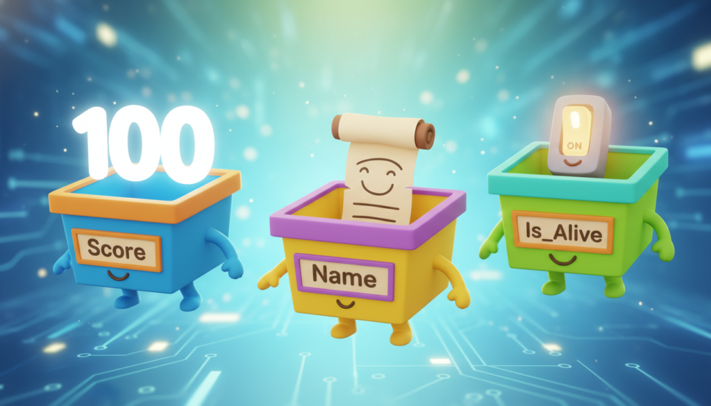 PRO TIP: A vibrant, cartoon-style illustration comparing variables to labeled storage boxes. One box is labeled ‘Score’ containing the number 100, another labeled ‘Name’ containing a name tag, and a third labeled ‘Is_Alive’ containing a light switch.