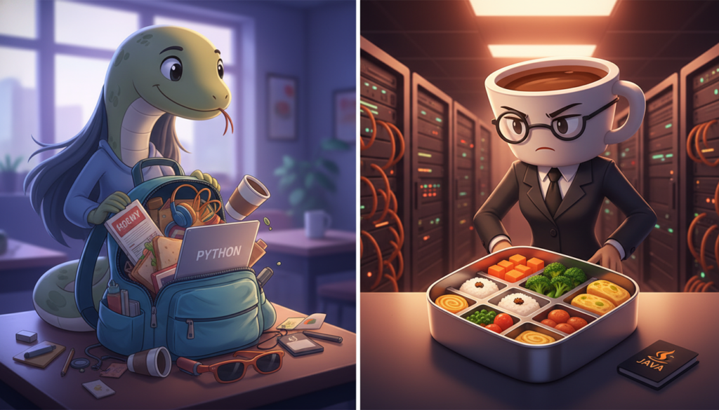 PRO TIP: A split-screen illustration showing ‘The Chill Teacher’ (Python) allowing a messy backpack of different items, versus ‘The Strict Teacher’ (Java) checking a rigid bento box where every food item must fit perfectly into its specific slot.